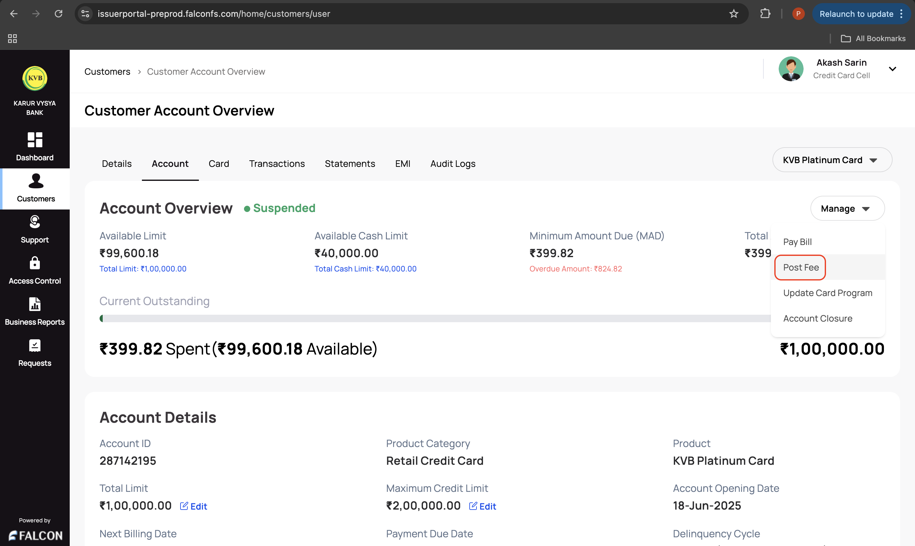 3. Go to the Account tab, click the Manage drop-down displayed in the top-right corner of the Account Overview section, and click Post Fee.
