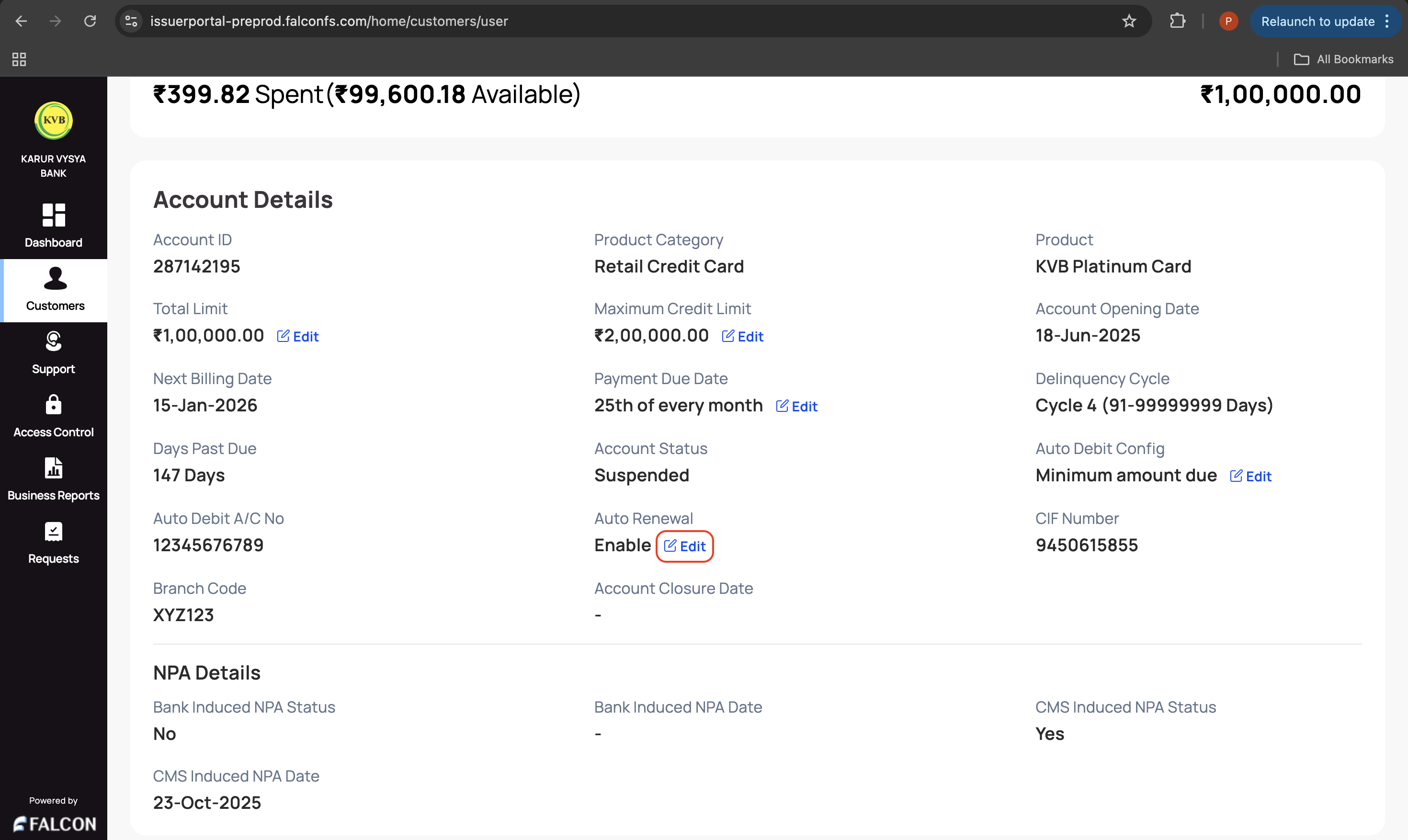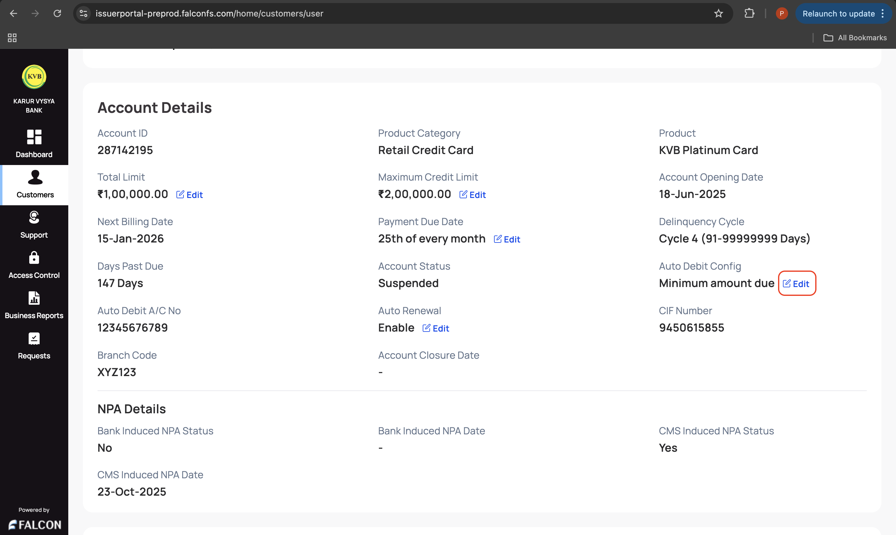 3. Go to the Account tab and click Edit displayed in the Auto Debit Config field under the Account Details section.