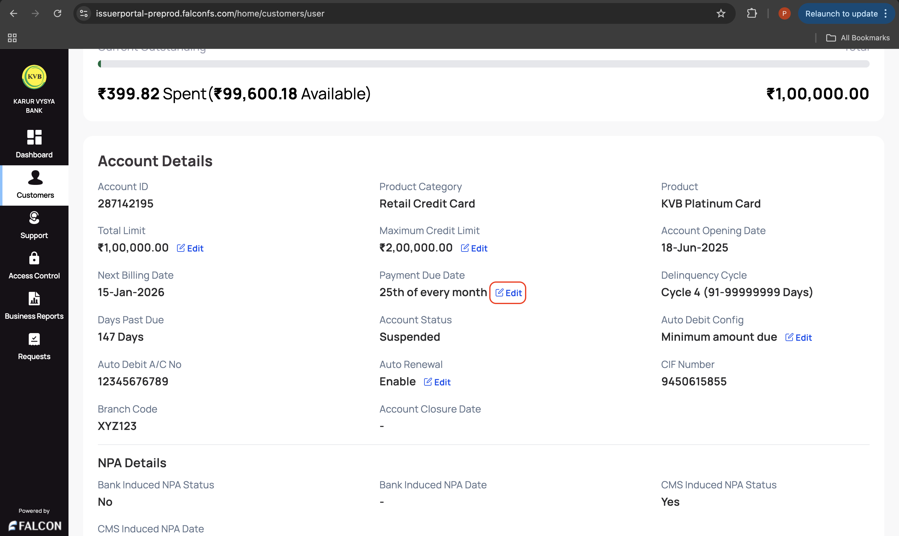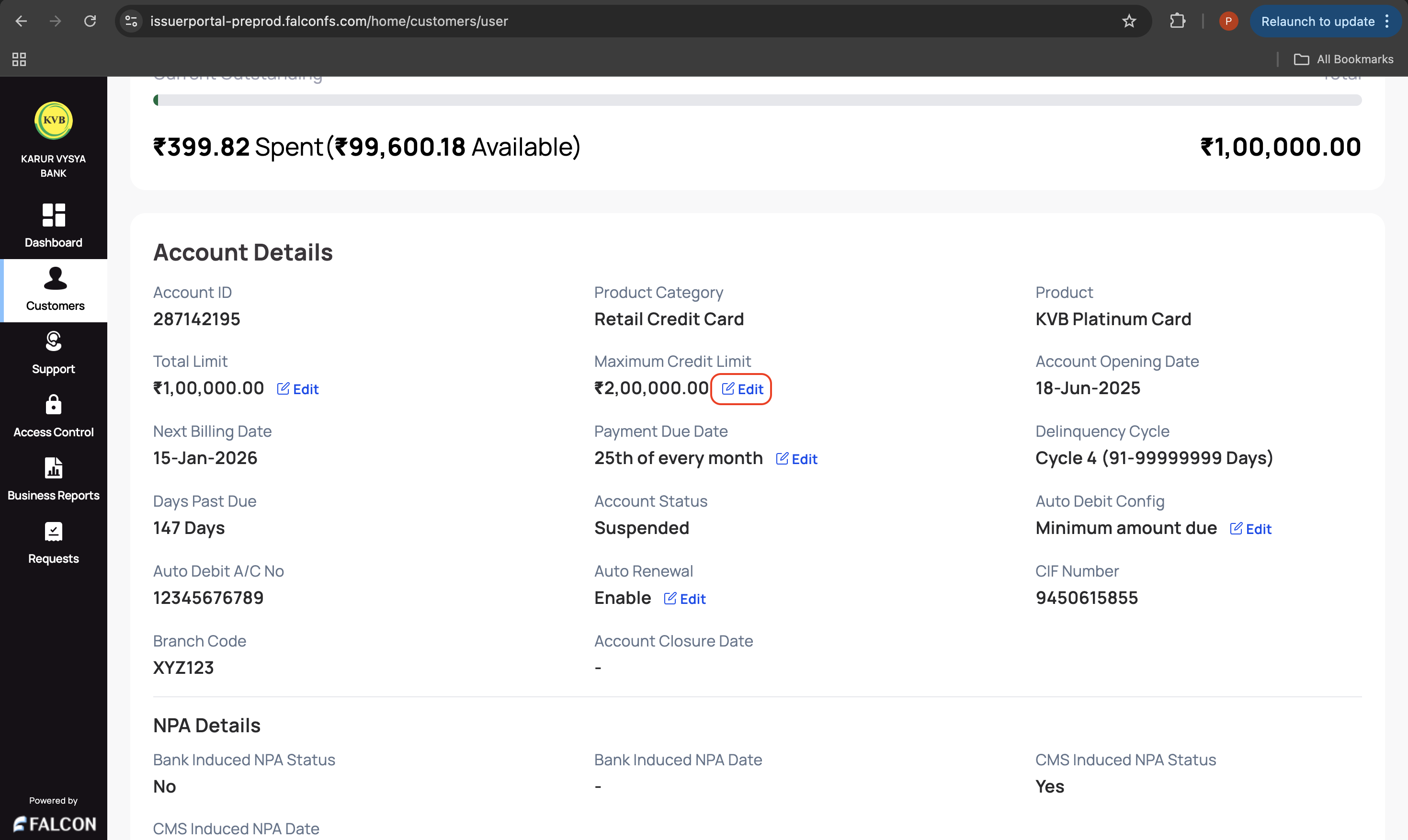 3. Go to the Account tab and click Edit displayed in the Maximum Credit Limit field under the Account Details section.