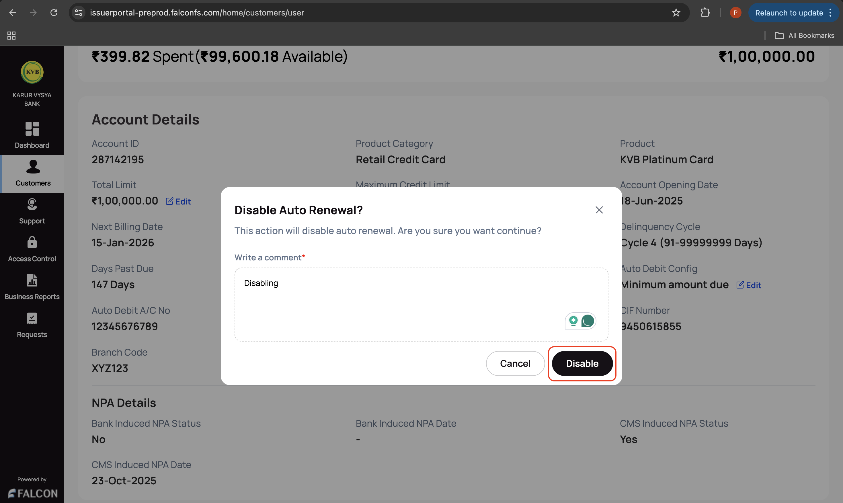 1. Provide a comment or a reason to enable/disable auto-renewal in the Enable/Disable Auto Renewal? pop-up page.