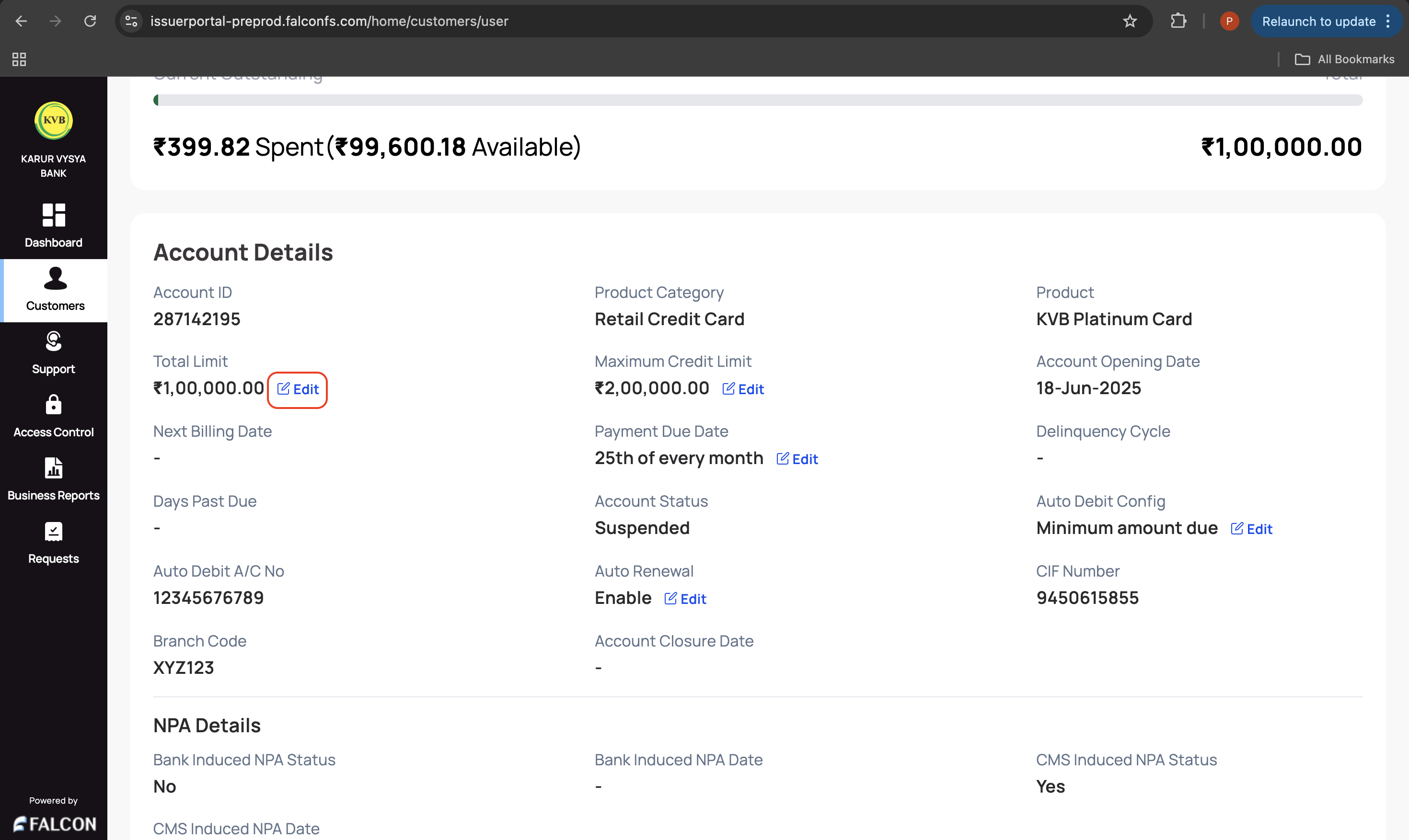 3. Go to the Account tab and click Edit displayed in the Total Limit field under the Account Details section.