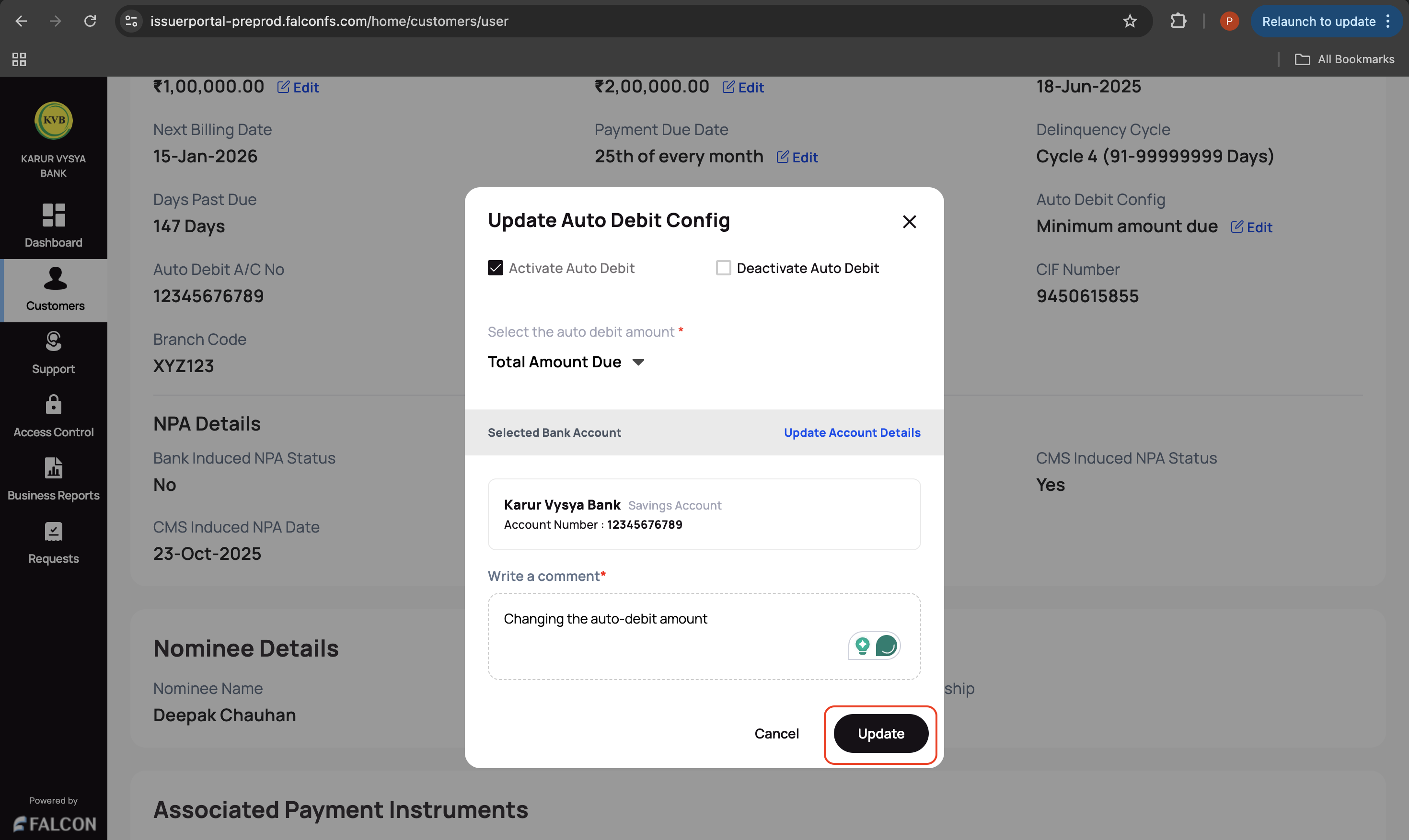 You have successfully raised a request to update the auto-debit configuration. You can check the status of the request in the Requests page.