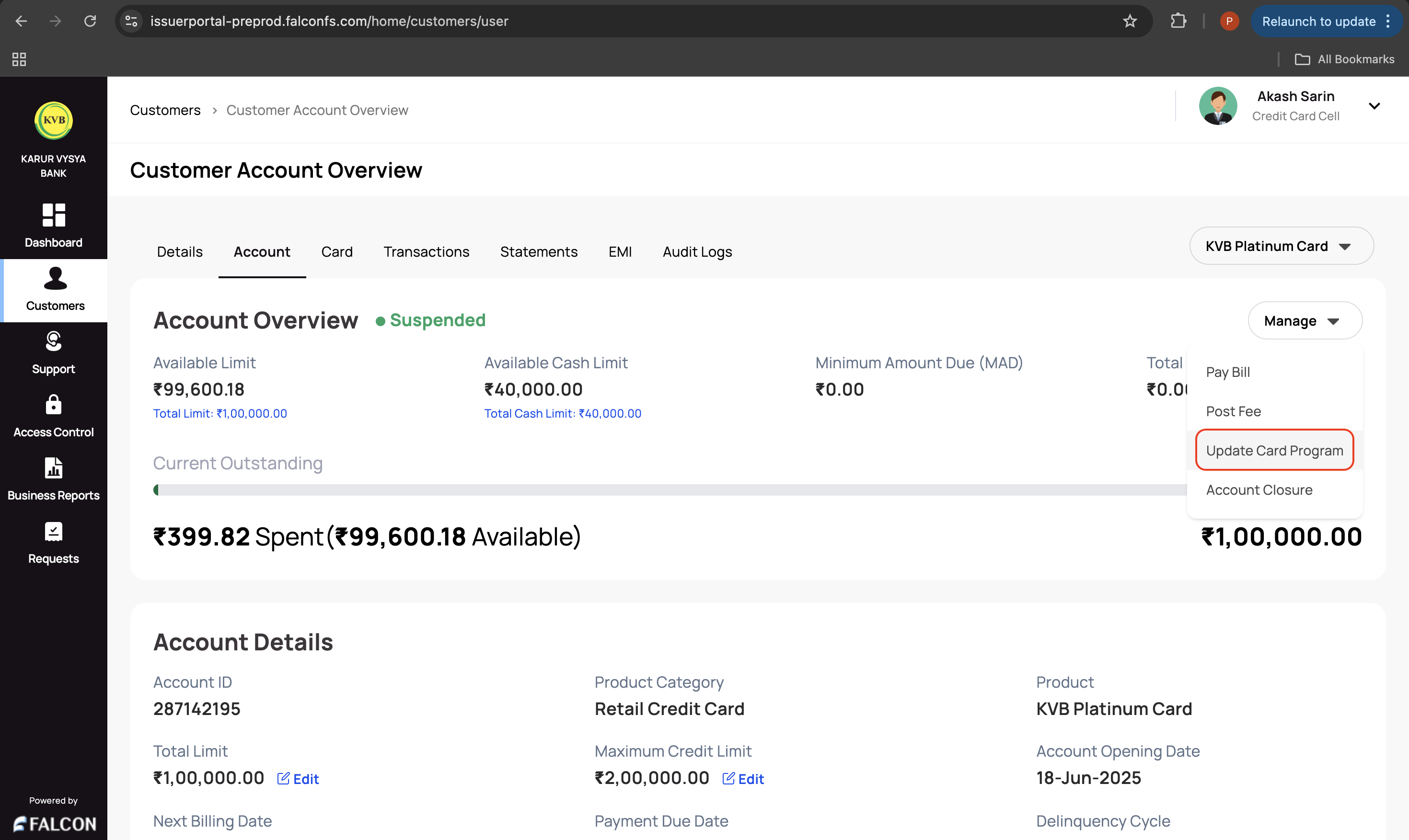 3. Go to the Account tab, click the Manage drop-down displayed in the top-right corner of the Account Overview section, and click Update Card Program.