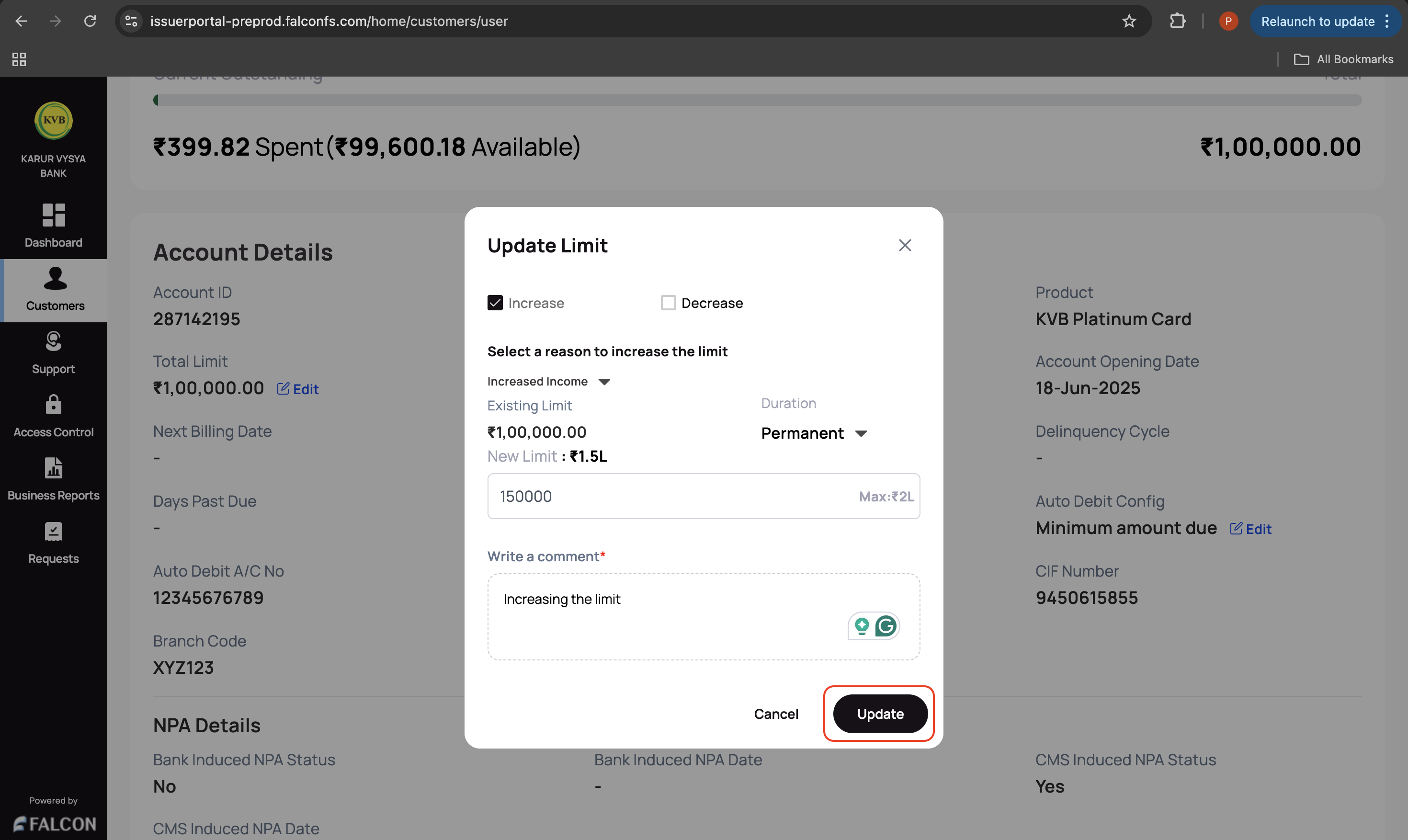 • Select the reason to increase/decrease the limit from the drop-down list.