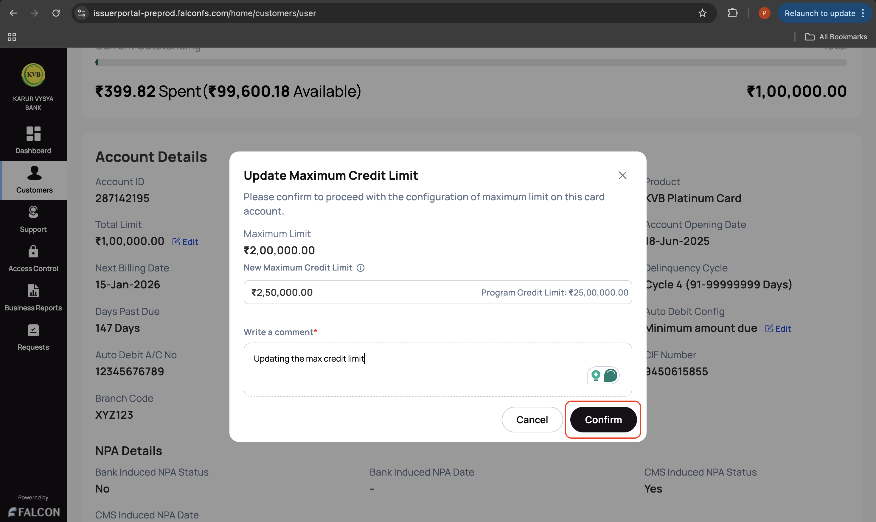 1. Provide the following details in the Update Maximum Credit Limit pop-up page.