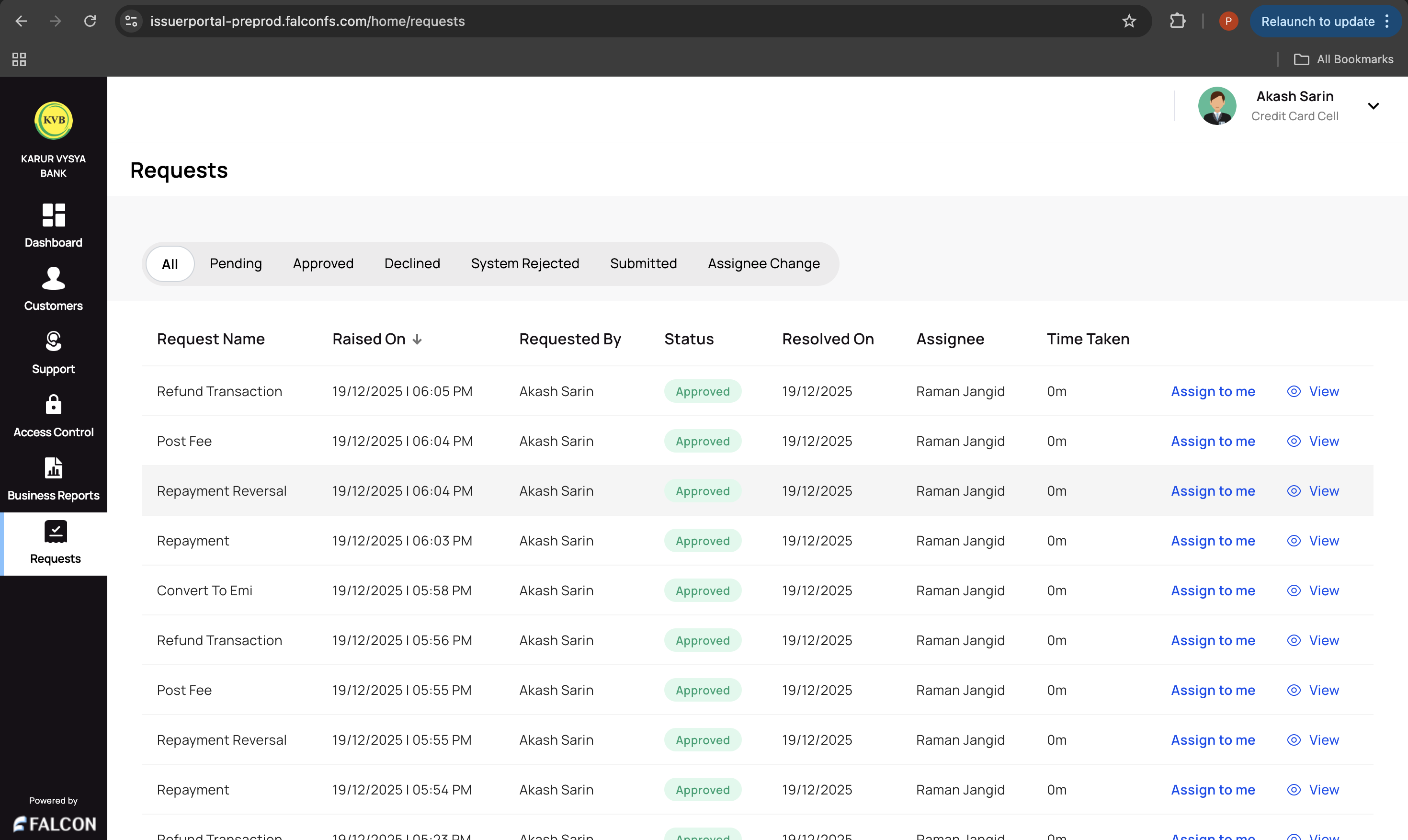 This page displays a list of requests raised by admin and support makers. This page is divided into the following tabs.