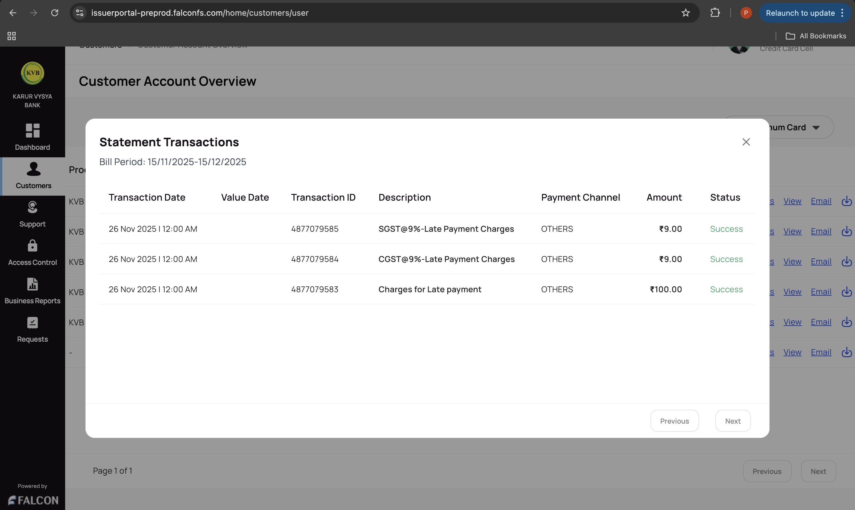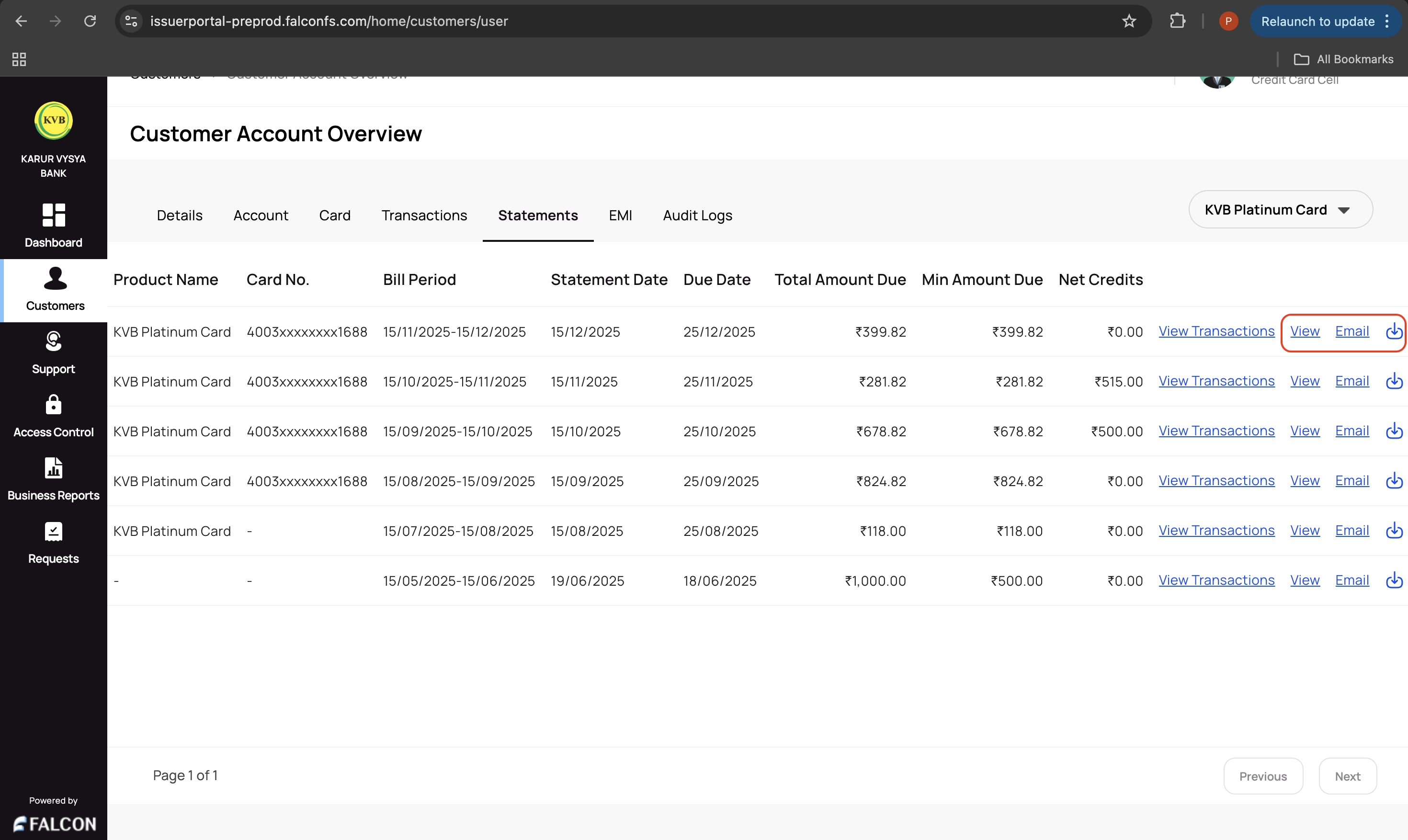 Go to the Statements tab and click View Transactions against a particular statement to view a list of transactions.