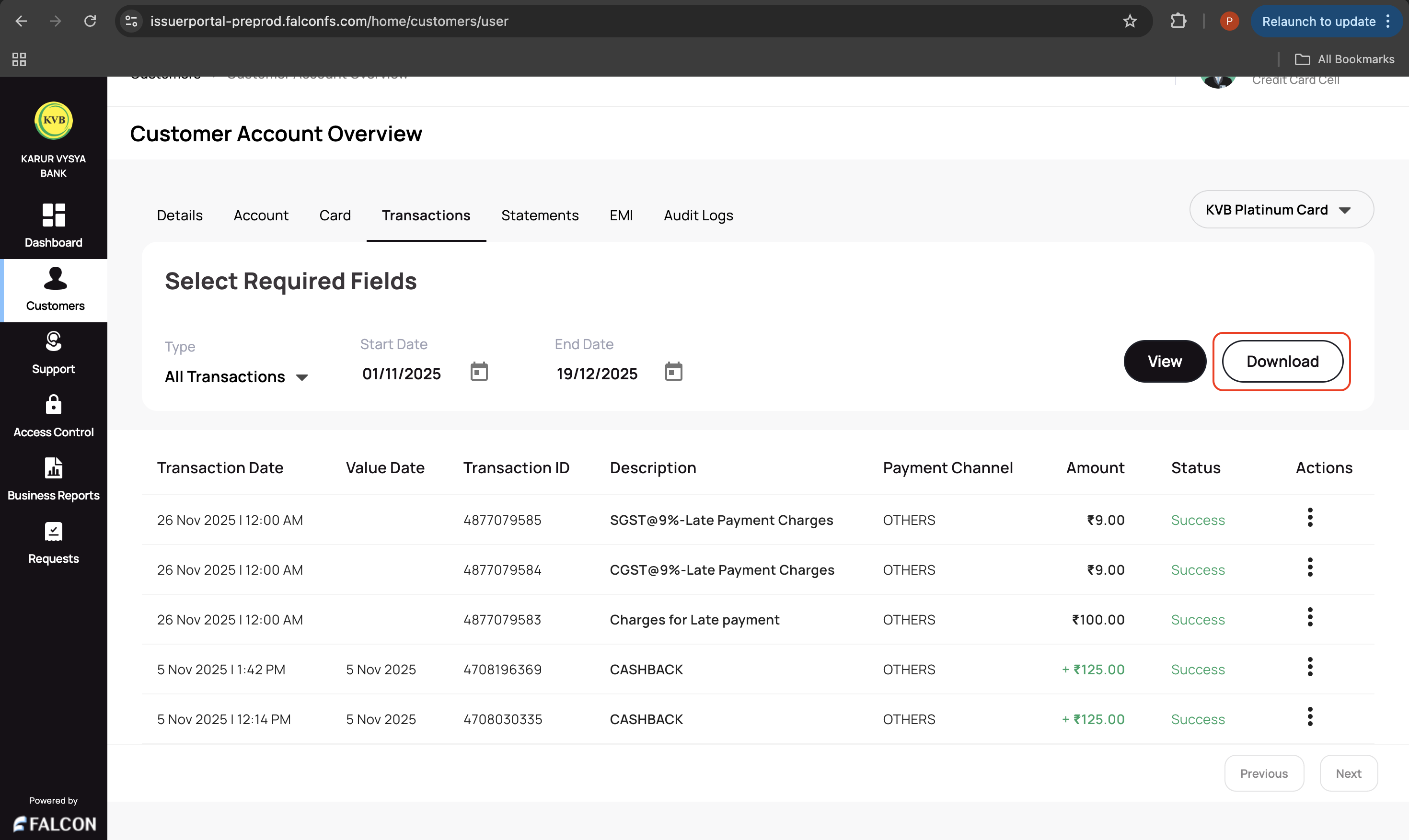 - Click Download to download the list of transactions.
