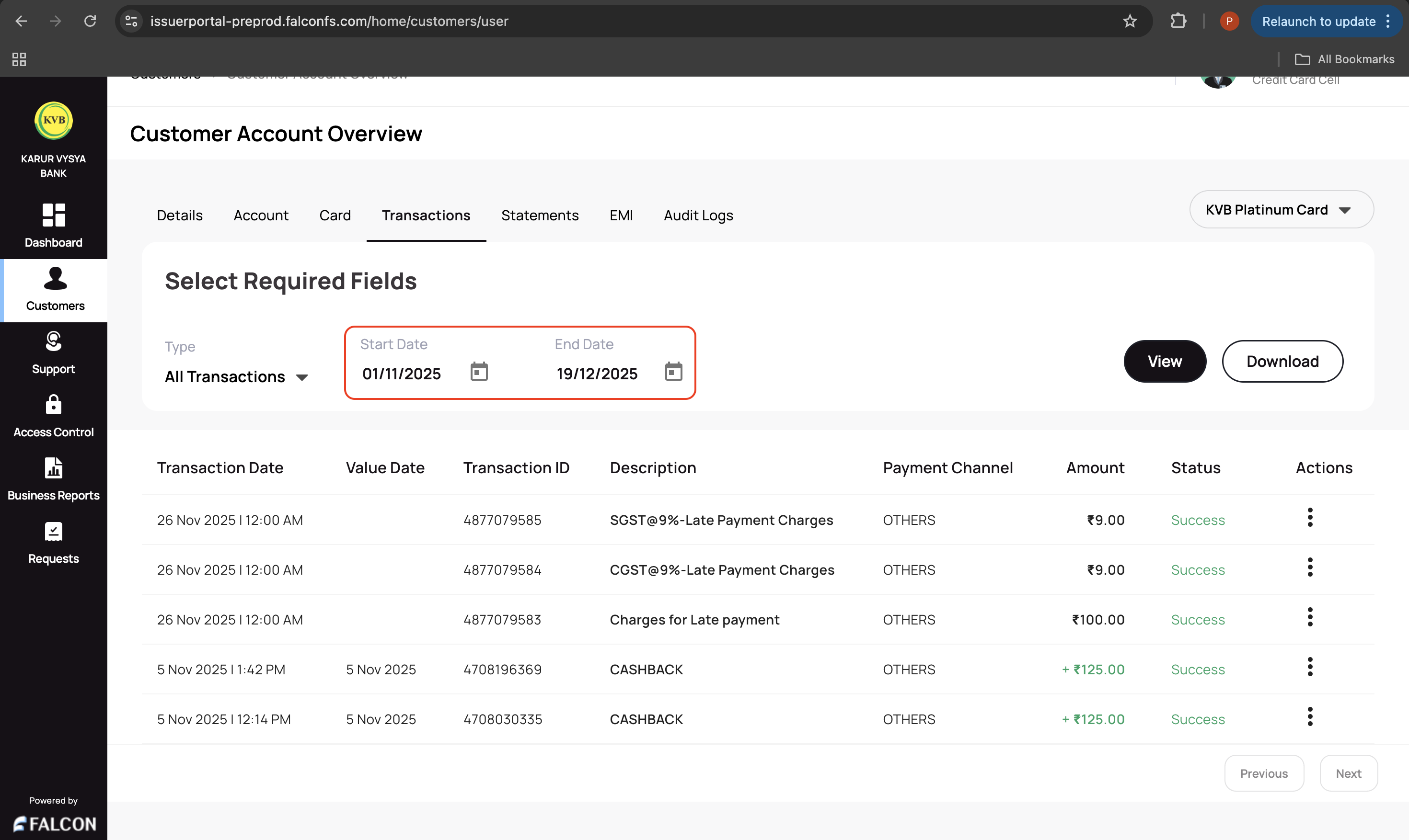 You can view or download transactions depending on the start date and end date.
