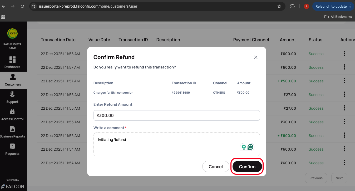 - Provide the following details and click Confirm in the Confirm Refund pop-up page.