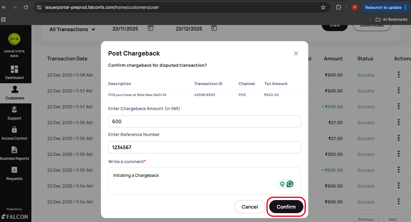 - Provide the following details and click Confirm in the Post Chargeback pop-up page to submit your request.
