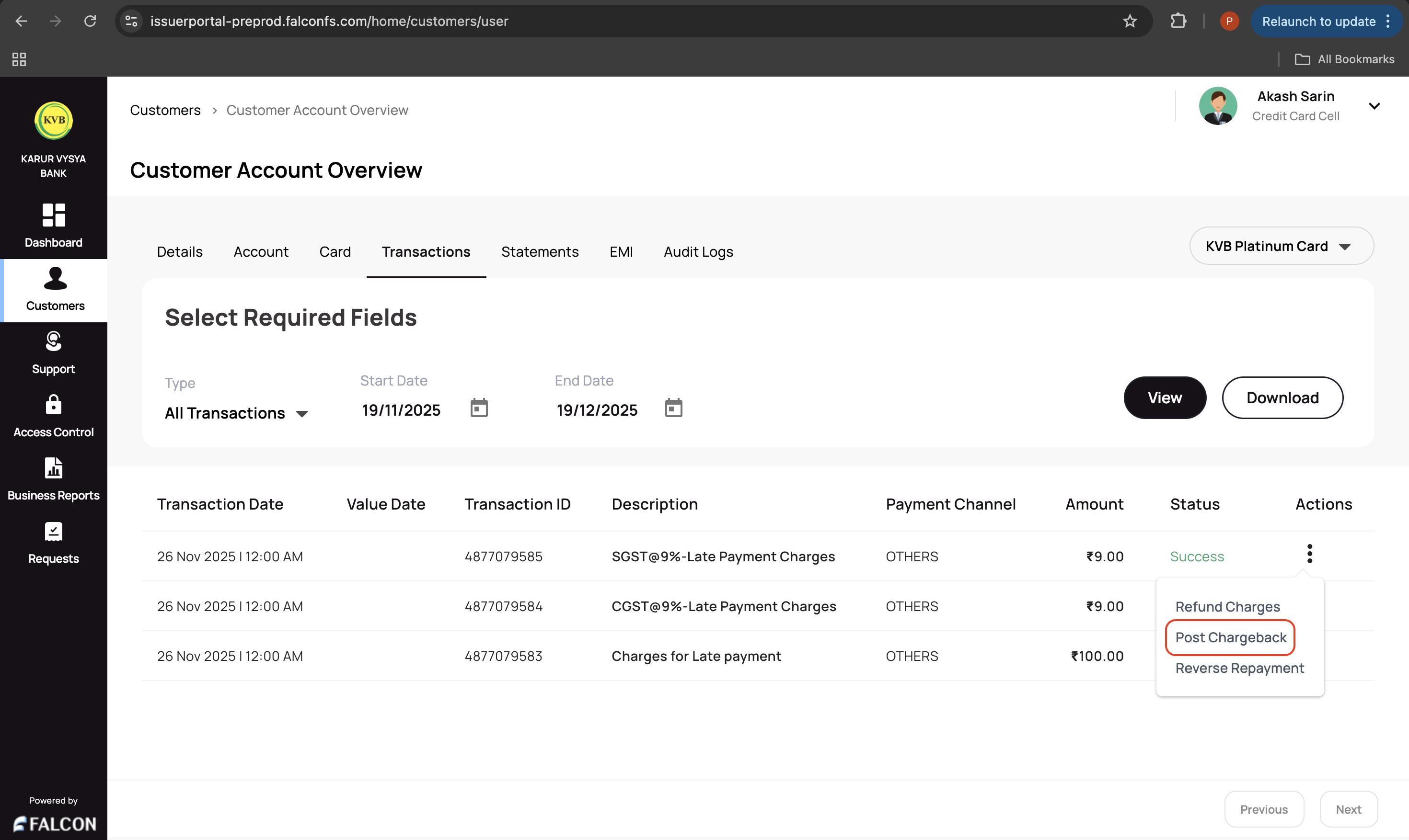 Go to the Transaction tab, click the three dots against the transaction, and click Post Chargeback.